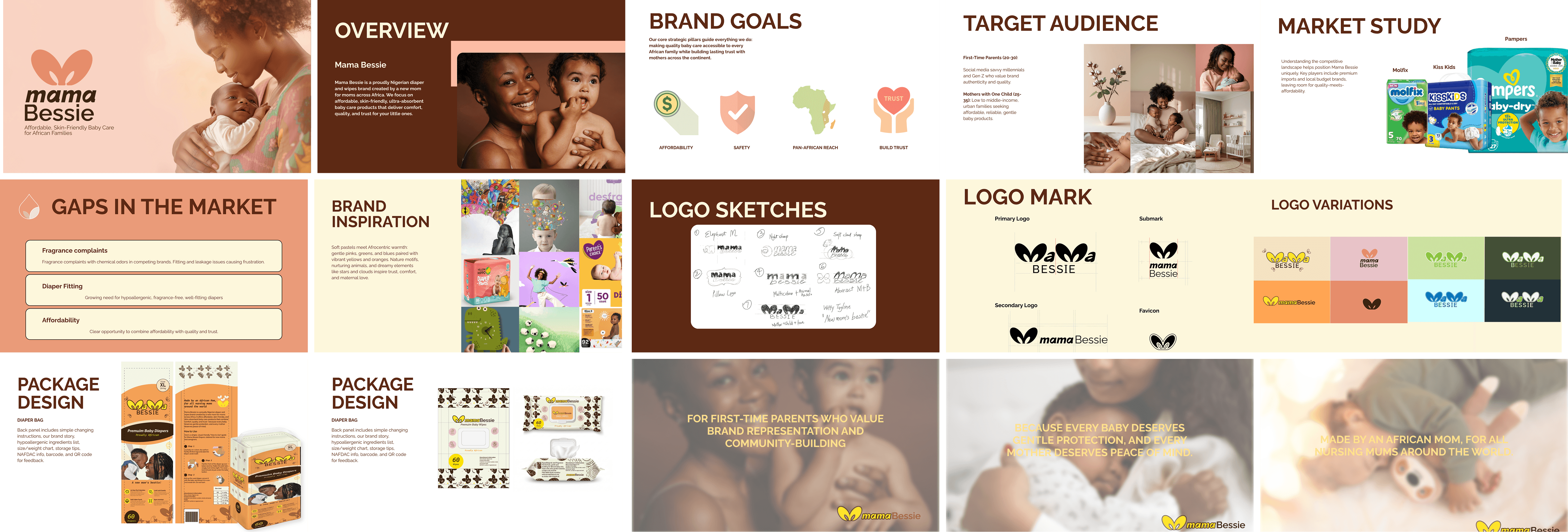 The Mama Bessie design process was a strategic journey that transformed the "by a mom, for moms" ethos into a premium visual identity through deep market analysis and creative exploration.